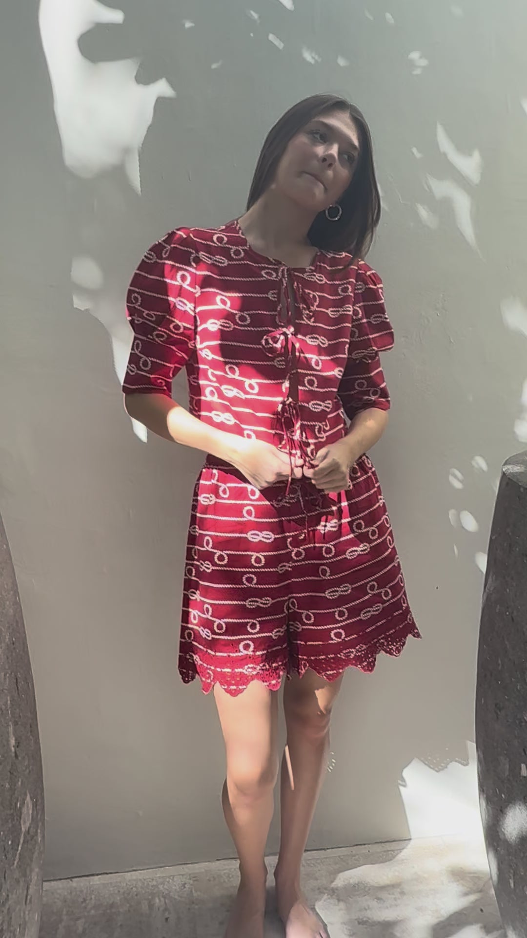 Featuring a flattering tie-front silhouette and a softly scalloped hem, this lightweight style offers movement, texture, and versatility. The short sleeves and breathable fabric make it ideal for sun-drenched days, while the graphic red-and-ivory print adds a bold, timeless finish.